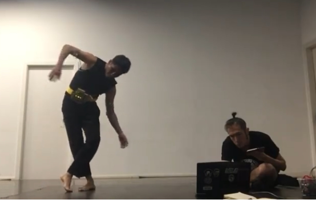 El cuerpo de Pablo se presenta como un flujo constante de información. Vibraciones, señales, voz, gestos y tensiones, un cuerpo con-movido por la amplificación de sus procesos internos al mismo tiempo que acciona y modifica un ambiente sonoro gracias a un sistema looper de audio con el que reproduce a manera de fragmentos de textos y sonidos que el mismo graba y de los cuales es puente.